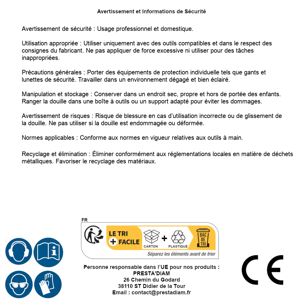 | AVERTISSEMENT et SECURITE | Identification de la personne responsable dans l’UE : Nom : PRESTA'DIAM. Adresse : 26 Chemin du Godard, 38110 ST Didier de la Tour (France). Email : contact@prestadiam.fr. |