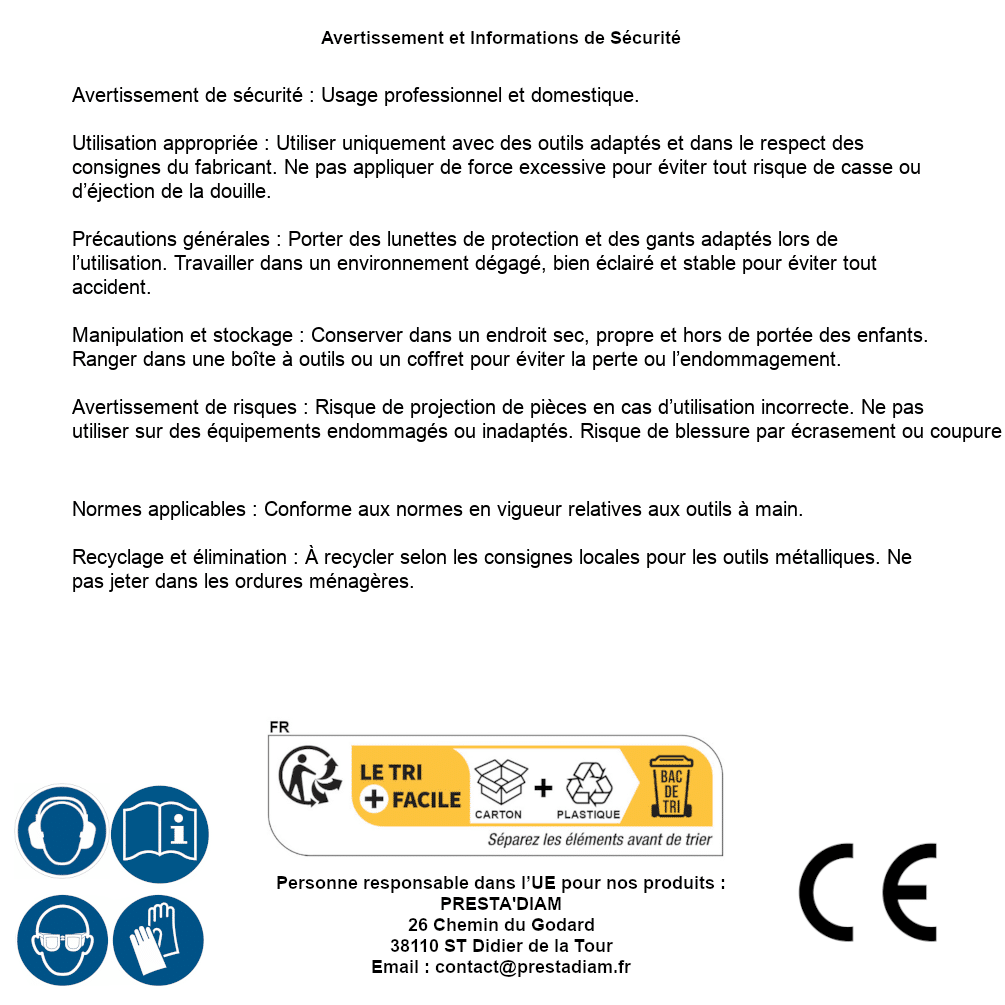 | AVERTISSEMENT et SECURITE | Identification de la personne responsable dans l’UE : Nom : PRESTA'DIAM. Adresse : 26 Chemin du Godard, 38110 ST Didier de la Tour (France). Email : contact@prestadiam.fr. |