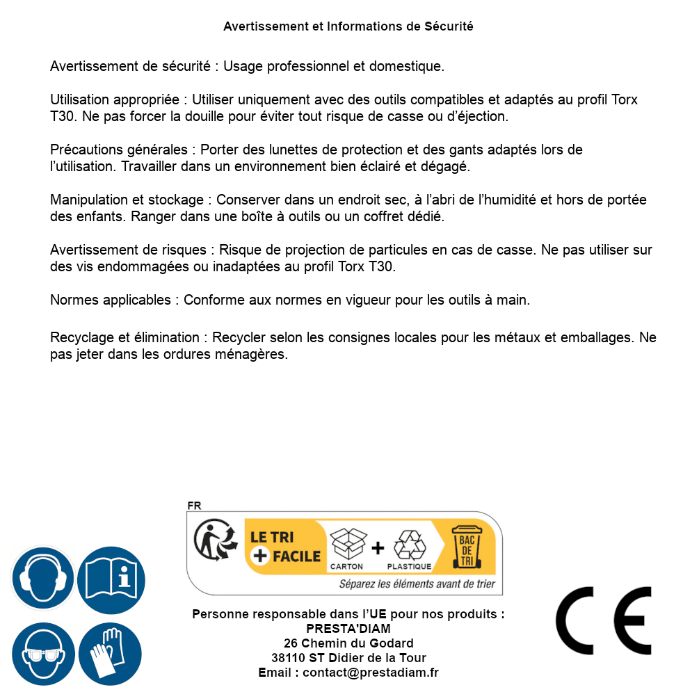 | AVERTISSEMENT et SECURITE | Identification de la personne responsable dans l’UE : Nom : PRESTA'DIAM. Adresse : 26 Chemin du Godard, 38110 ST Didier de la Tour (France). Email : contact@prestadiam.fr. |