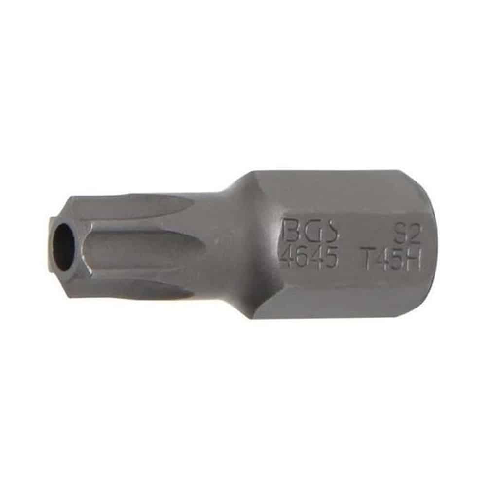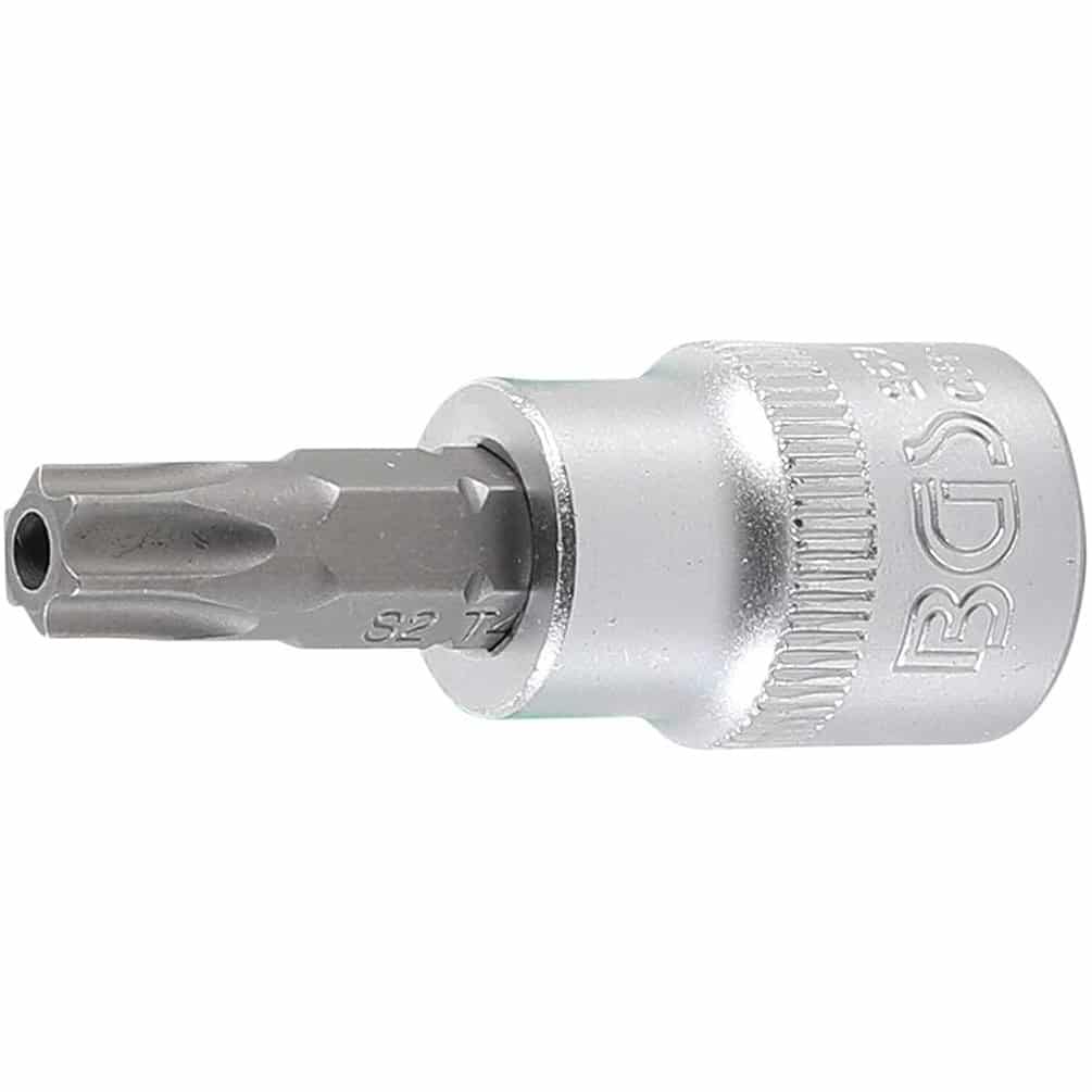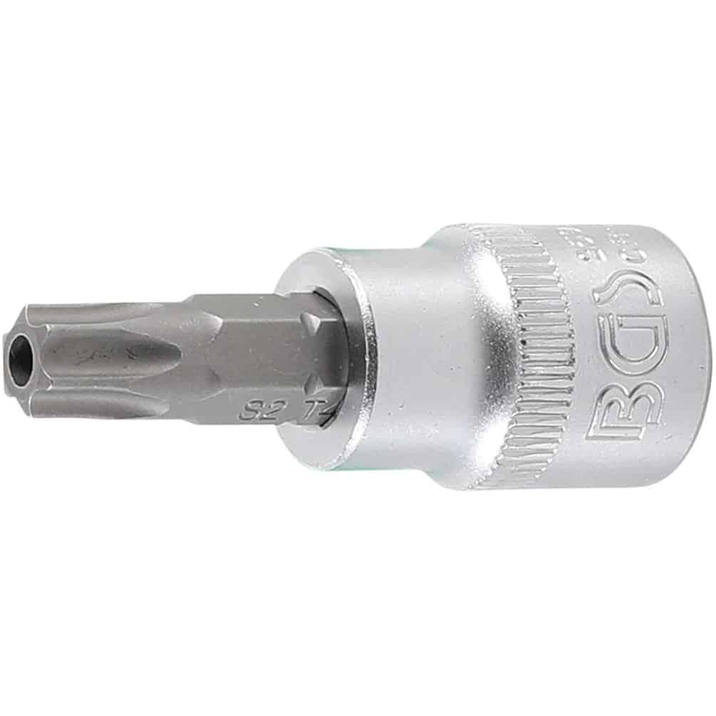 La douille à embouts 10 mm (3/8") avec profil T pour Torx et perçage T45 de la marque BGS est un outil de précision conçu pour les travaux de vissage et dévissage nécessitant une fixation sécurisée sur des vis Torx. Sa conception robuste garantit une excellente durabilité et une transmission optimale du couple.Caractéristiques principales