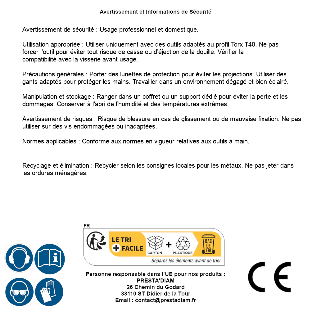| AVERTISSEMENT et SECURITE | Identification de la personne responsable dans l’UE : Nom : PRESTA'DIAM. Adresse : 26 Chemin du Godard, 38110 ST Didier de la Tour (France). Email : contact@prestadiam.fr. |