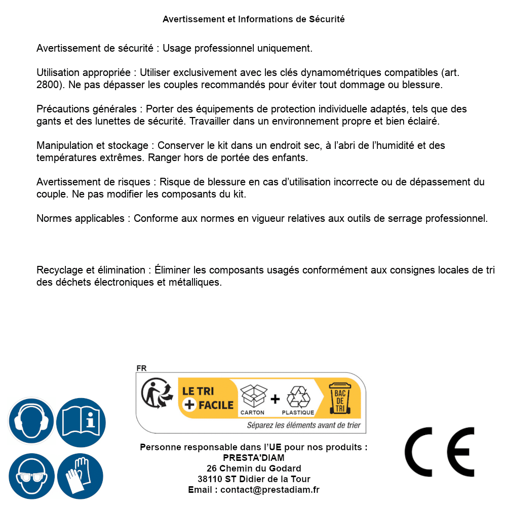 | AVERTISSEMENT et SECURITE | Identification de la personne responsable dans l’UE : Nom : PRESTA'DIAM. Adresse : 26 Chemin du Godard, 38110 ST Didier de la Tour (France). Email : contact@prestadiam.fr. |