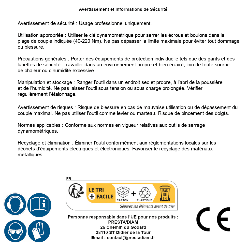 | AVERTISSEMENT et SECURITE | Identification de la personne responsable dans l’UE : Nom : PRESTA'DIAM. Adresse : 26 Chemin du Godard, 38110 ST Didier de la Tour (France). Email : contact@prestadiam.fr. |