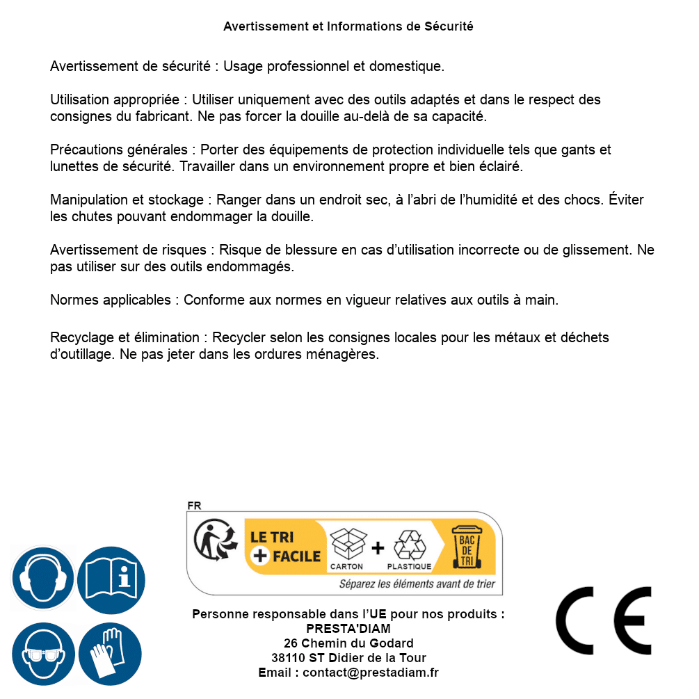 | AVERTISSEMENT et SECURITE | Identification de la personne responsable dans l’UE : Nom : PRESTA'DIAM. Adresse : 26 Chemin du Godard, 38110 ST Didier de la Tour (France). Email : contact@prestadiam.fr. |