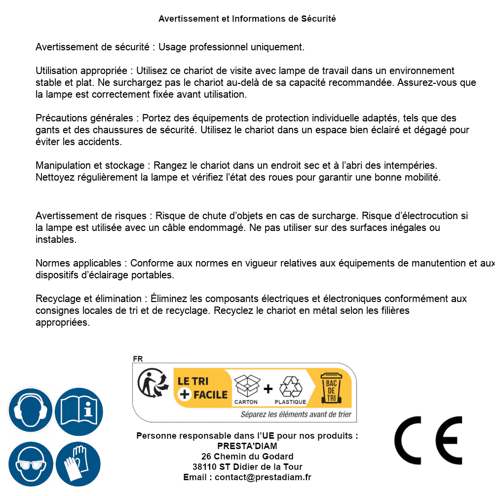 | AVERTISSEMENT et SECURITE | Identification de la personne responsable dans l’UE : Nom : PRESTA'DIAM. Adresse : 26 Chemin du Godard, 38110 ST Didier de la Tour (France). Email : contact@prestadiam.fr. |