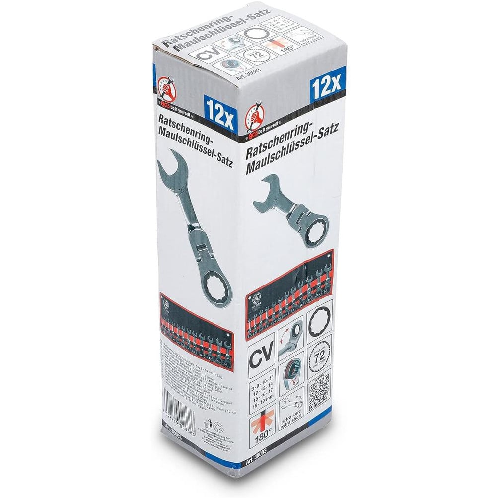 Ce jeu de clés mixtes à cliquet extra court de la marque BGS comprend 12 pièces couvrant les tailles de 8 à 19 mm. Conçu pour offrir une grande précision et une maniabilité optimale, ce set est idéal pour les travaux mécaniques et d'entretien nécessitant un accès dans des espaces restreints.Caractéristiques principales