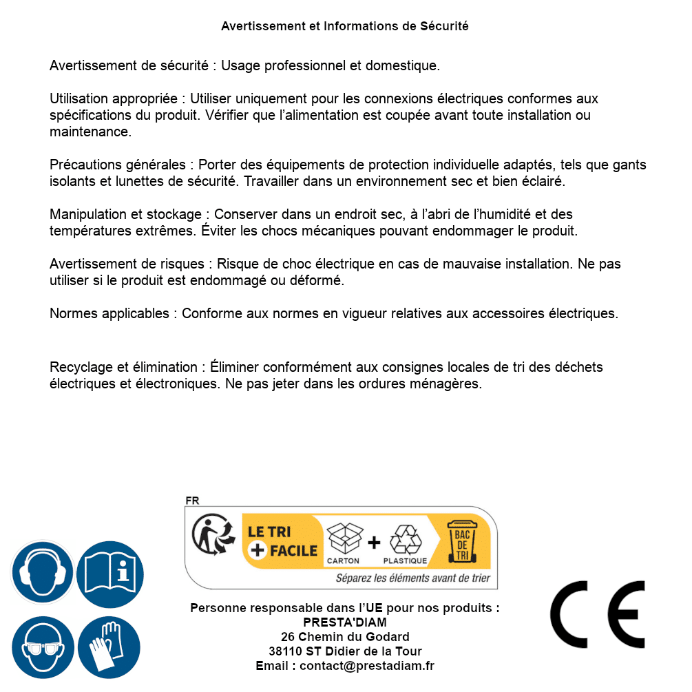| AVERTISSEMENT et SECURITE | Identification de la personne responsable dans l’UE : Nom : PRESTA'DIAM. Adresse : 26 Chemin du Godard, 38110 ST Didier de la Tour (France). Email : contact@prestadiam.fr. |