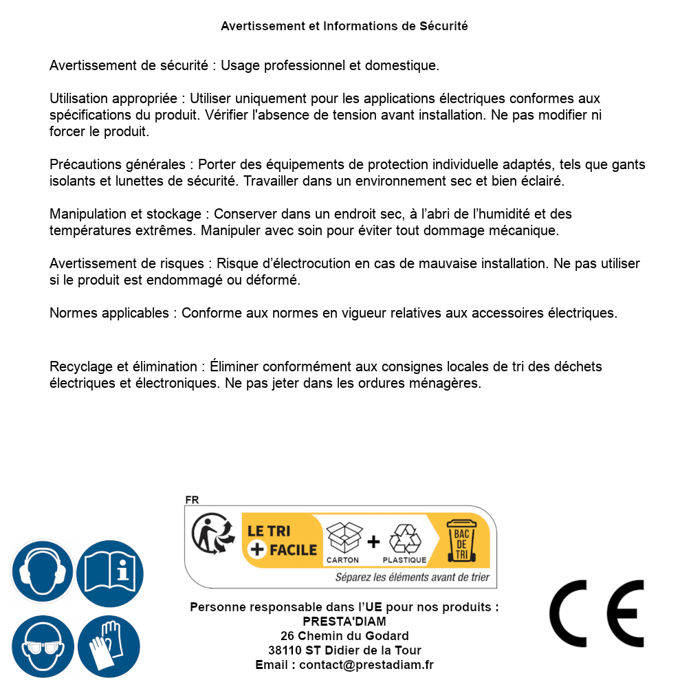 | AVERTISSEMENT et SECURITE | Identification de la personne responsable dans l’UE : Nom : PRESTA'DIAM. Adresse : 26 Chemin du Godard, 38110 ST Didier de la Tour (France). Email : contact@prestadiam.fr. |