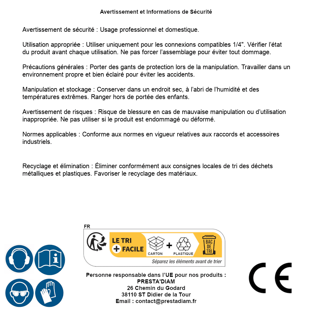 | AVERTISSEMENT et SECURITE | Identification de la personne responsable dans l’UE : Nom : PRESTA'DIAM. Adresse : 26 Chemin du Godard, 38110 ST Didier de la Tour (France). Email : contact@prestadiam.fr. |