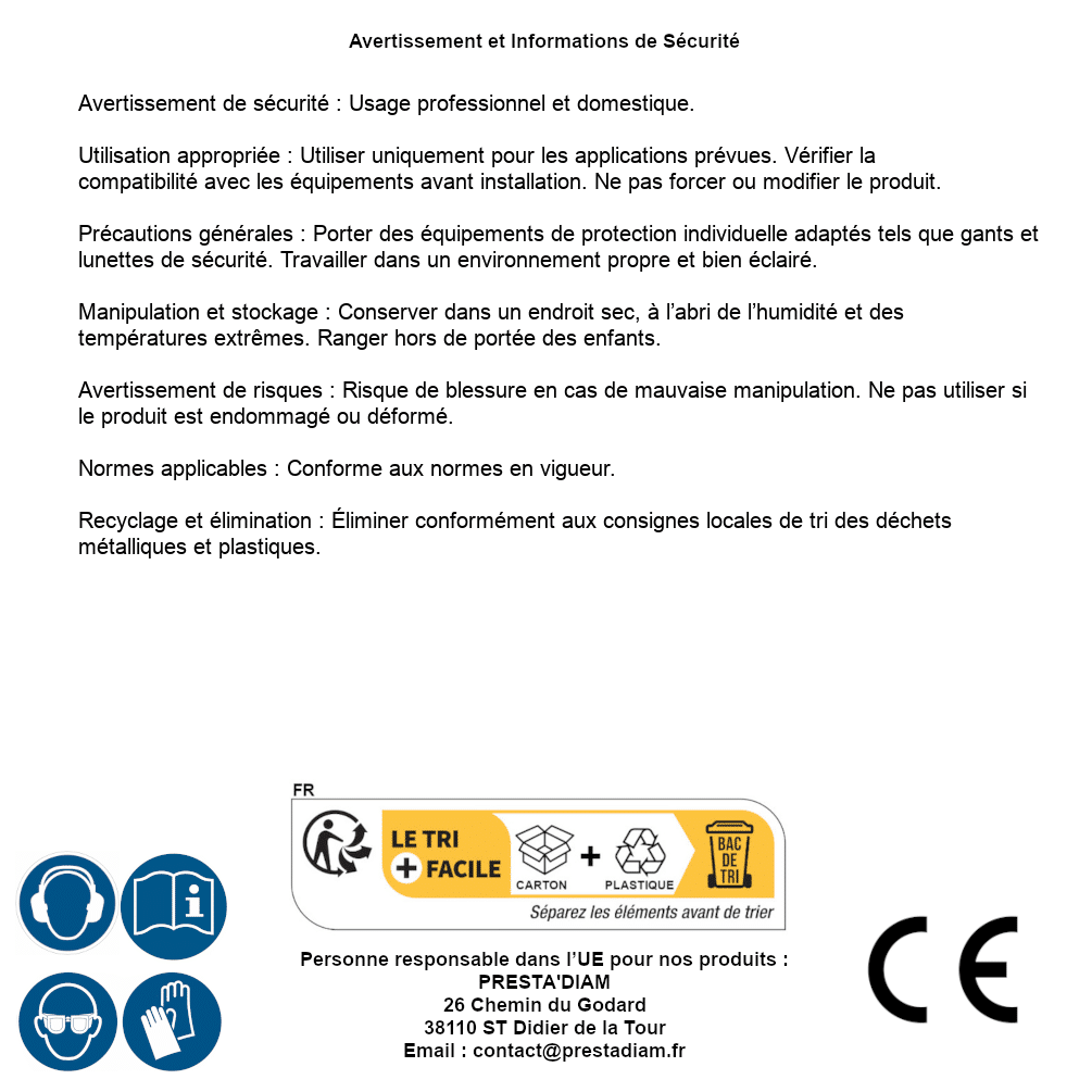 | AVERTISSEMENT et SECURITE | Identification de la personne responsable dans l’UE : Nom : PRESTA'DIAM. Adresse : 26 Chemin du Godard, 38110 ST Didier de la Tour (France). Email : contact@prestadiam.fr. |
