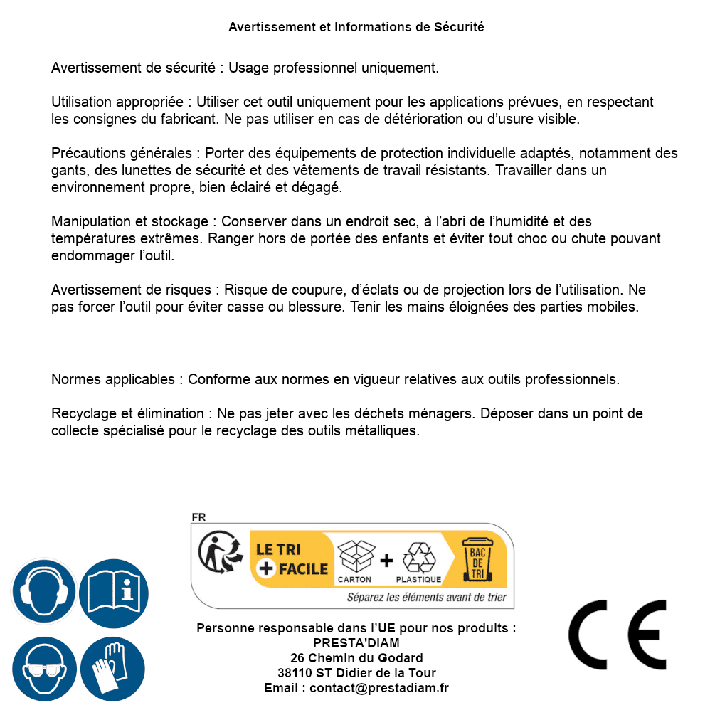 | AVERTISSEMENT et SECURITE | Identification de la personne responsable dans l’UE : Nom : PRESTA'DIAM. Adresse : 26 Chemin du Godard, 38110 ST Didier de la Tour (France). Email : contact@prestadiam.fr. |