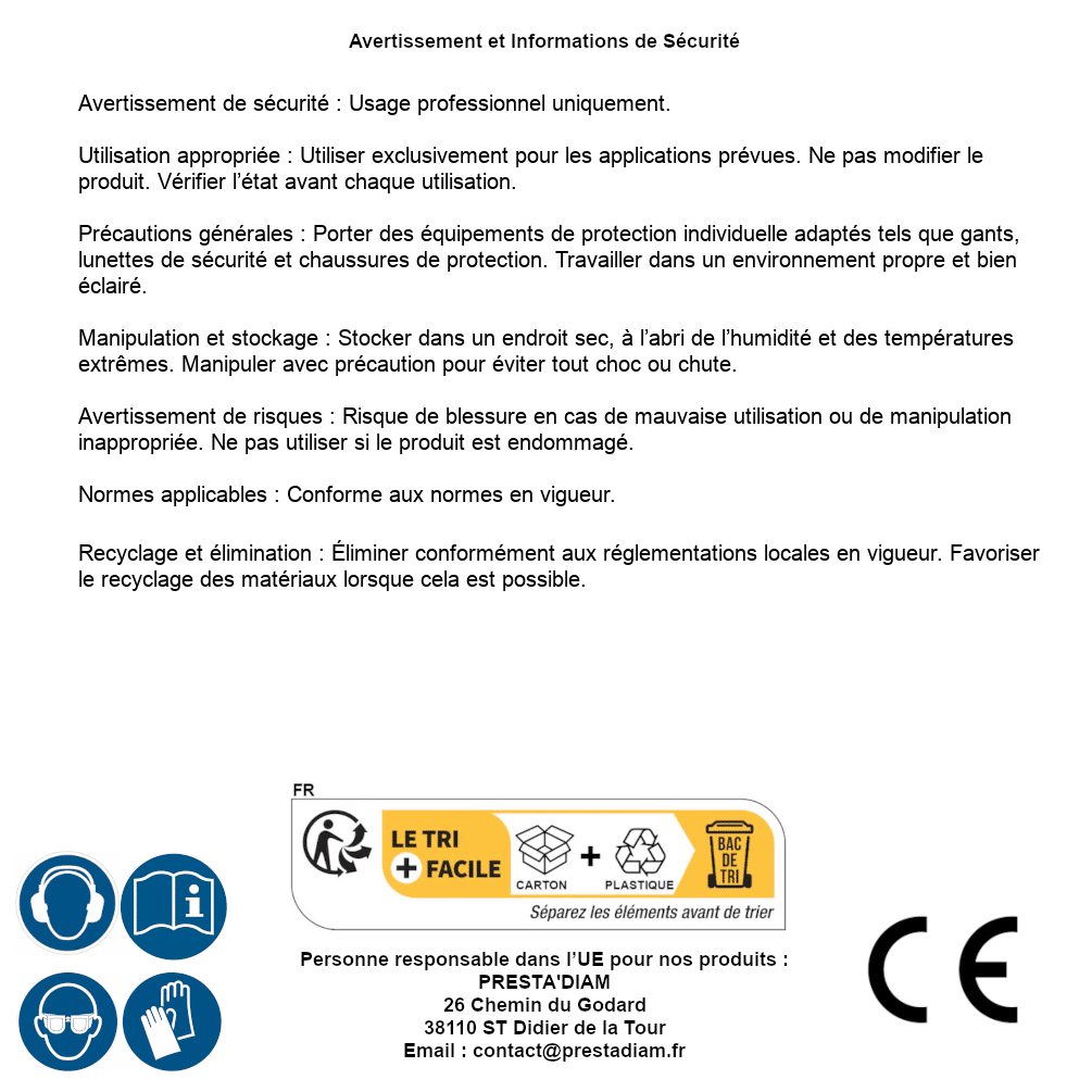 | AVERTISSEMENT et SECURITE | Identification de la personne responsable dans l’UE : Nom : PRESTA'DIAM. Adresse : 26 Chemin du Godard, 38110 ST Didier de la Tour (France). Email : contact@prestadiam.fr. |