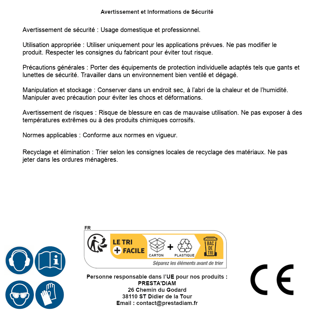 | AVERTISSEMENT et SECURITE | Identification de la personne responsable dans l’UE : Nom : PRESTA'DIAM. Adresse : 26 Chemin du Godard, 38110 ST Didier de la Tour (France). Email : contact@prestadiam.fr. |