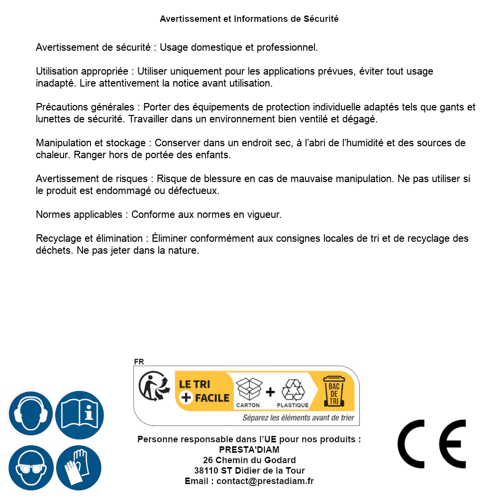 | AVERTISSEMENT et SECURITE | Identification de la personne responsable dans l’UE : Nom : PRESTA'DIAM. Adresse : 26 Chemin du Godard, 38110 ST Didier de la Tour (France). Email : contact@prestadiam.fr. |
