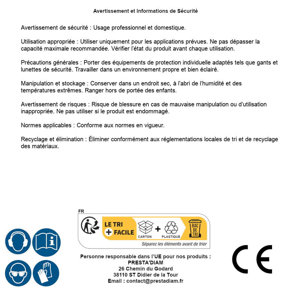 | AVERTISSEMENT et SECURITE | Identification de la personne responsable dans l’UE : Nom : PRESTA'DIAM. Adresse : 26 Chemin du Godard, 38110 ST Didier de la Tour (France). Email : contact@prestadiam.fr. |