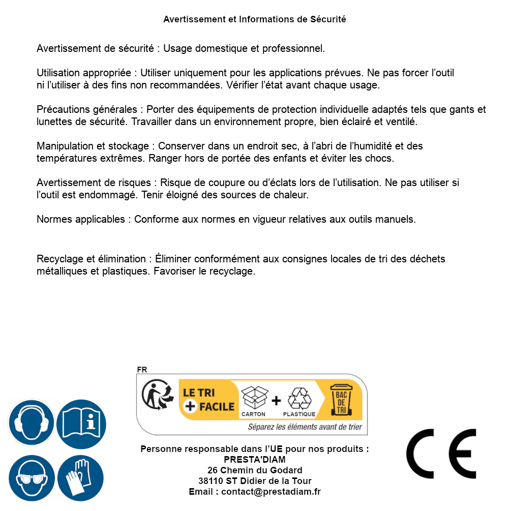 | AVERTISSEMENT et SECURITE | Identification de la personne responsable dans l’UE : Nom : PRESTA'DIAM. Adresse : 26 Chemin du Godard, 38110 ST Didier de la Tour (France). Email : contact@prestadiam.fr. |