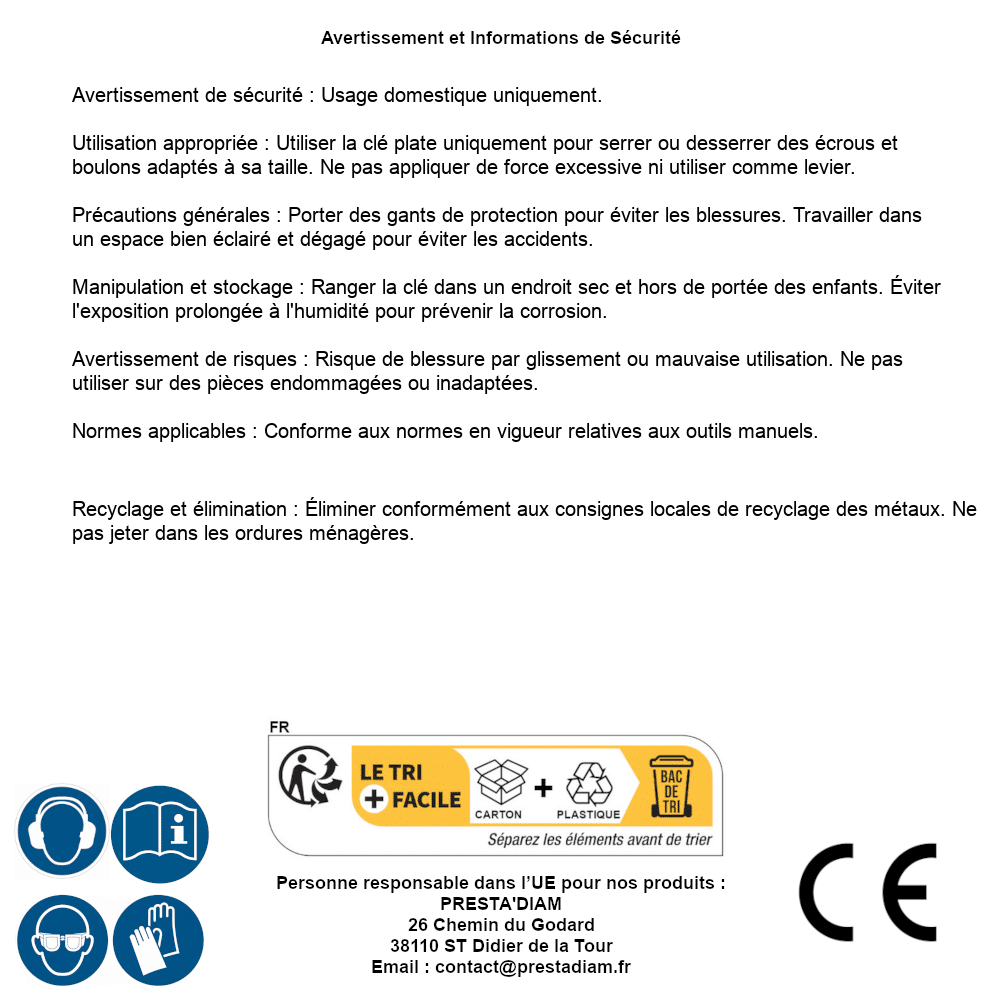 | AVERTISSEMENT et SECURITE | Identification de la personne responsable dans l’UE : Nom : PRESTA'DIAM. Adresse : 26 Chemin du Godard, 38110 ST Didier de la Tour (France). Email : contact@prestadiam.fr. |
