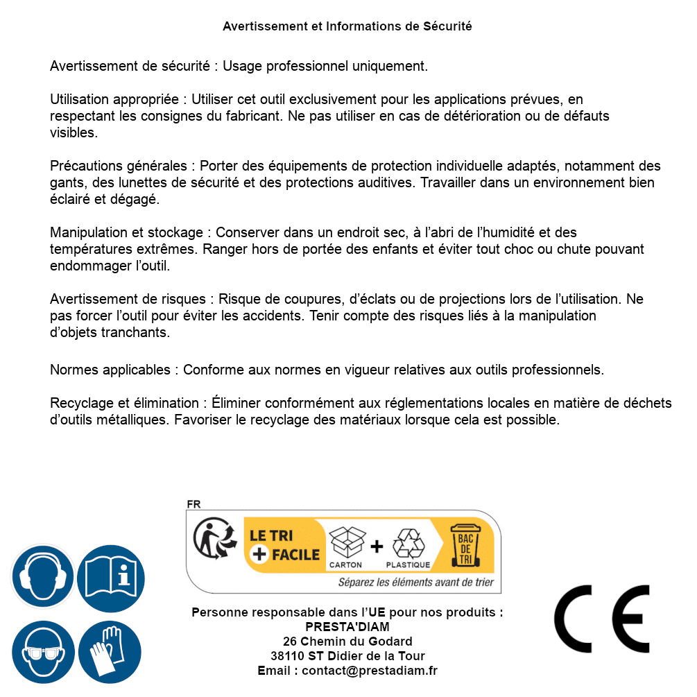 | AVERTISSEMENT et SECURITE | Identification de la personne responsable dans l’UE : Nom : PRESTA'DIAM. Adresse : 26 Chemin du Godard, 38110 ST Didier de la Tour (France). Email : contact@prestadiam.fr. |