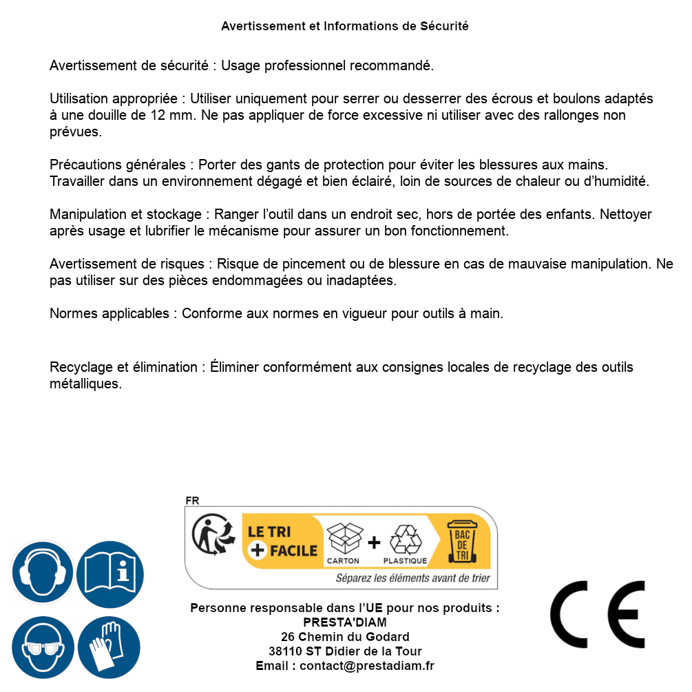 | AVERTISSEMENT et SECURITE | Identification de la personne responsable dans l’UE : Nom : PRESTA'DIAM. Adresse : 26 Chemin du Godard, 38110 ST Didier de la Tour (France). Email : contact@prestadiam.fr. |