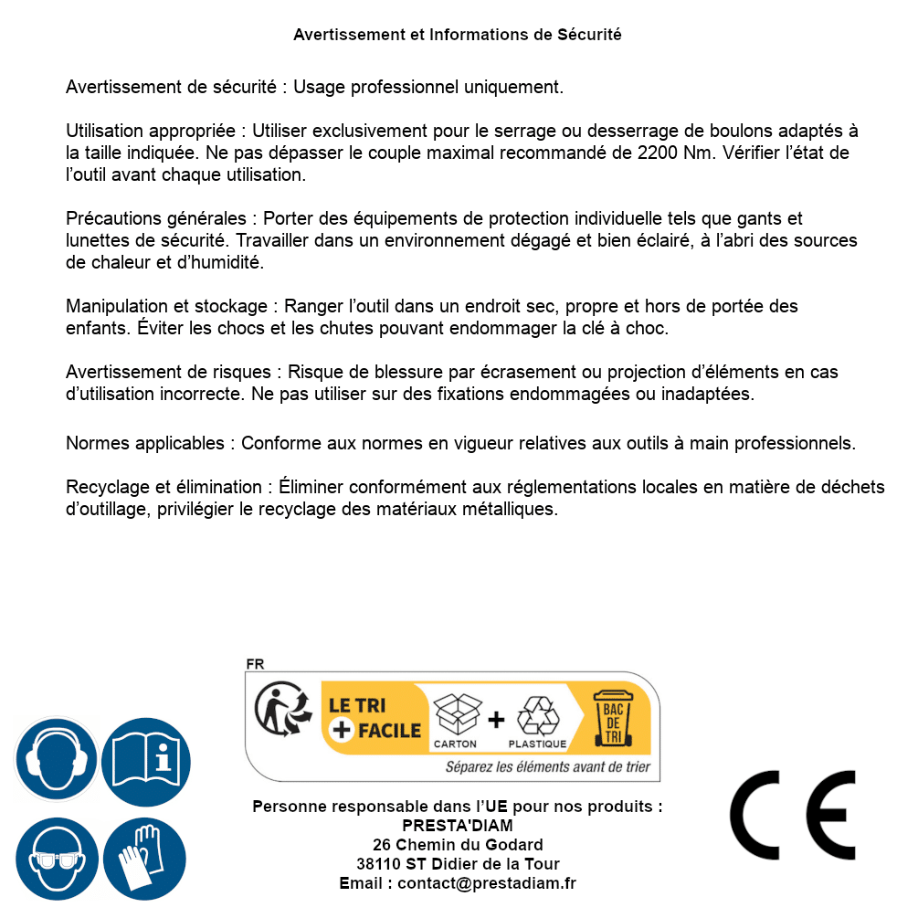 | AVERTISSEMENT et SECURITE | Identification de la personne responsable dans l’UE : Nom : PRESTA'DIAM. Adresse : 26 Chemin du Godard, 38110 ST Didier de la Tour (France). Email : contact@prestadiam.fr. |