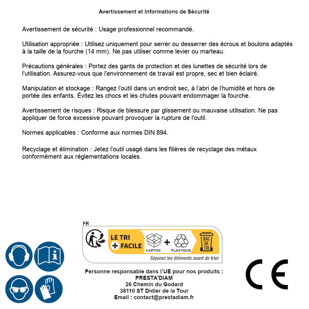 | AVERTISSEMENT et SECURITE | Identification de la personne responsable dans l’UE : Nom : PRESTA'DIAM. Adresse : 26 Chemin du Godard, 38110 ST Didier de la Tour (France). Email : contact@prestadiam.fr. |
