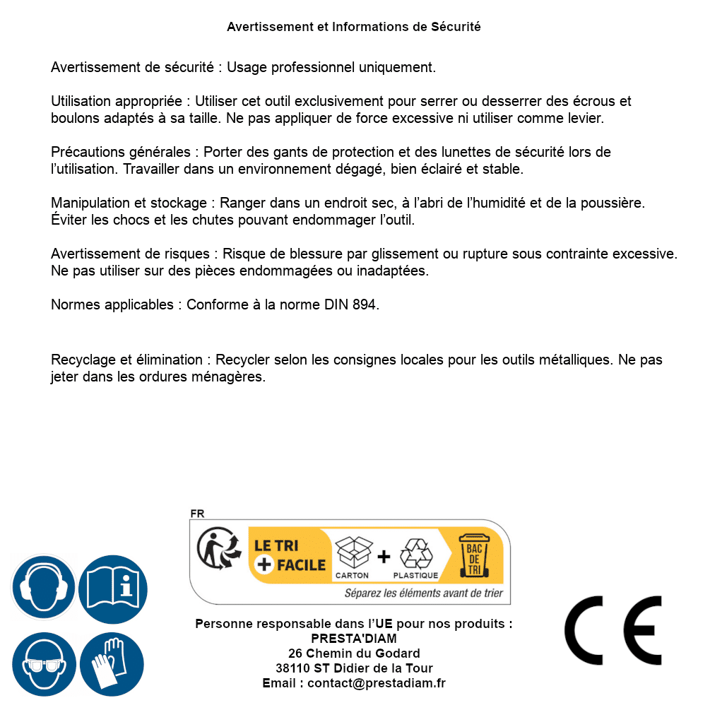 | AVERTISSEMENT et SECURITE | Identification de la personne responsable dans l’UE : Nom : PRESTA'DIAM. Adresse : 26 Chemin du Godard, 38110 ST Didier de la Tour (France). Email : contact@prestadiam.fr. |
