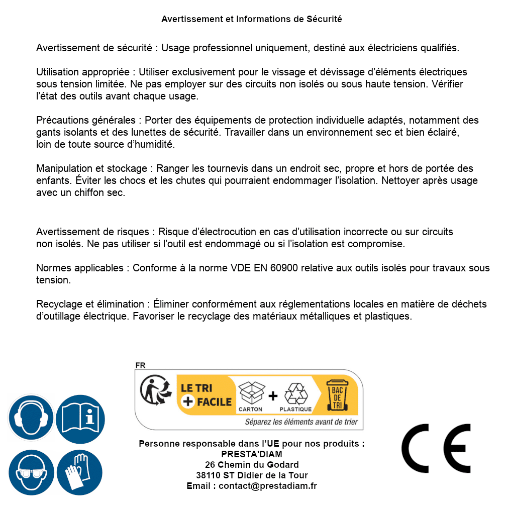 | AVERTISSEMENT et SECURITE | Identification de la personne responsable dans l’UE : Nom : PRESTA'DIAM. Adresse : 26 Chemin du Godard, 38110 ST Didier de la Tour (France). Email : contact@prestadiam.fr. |