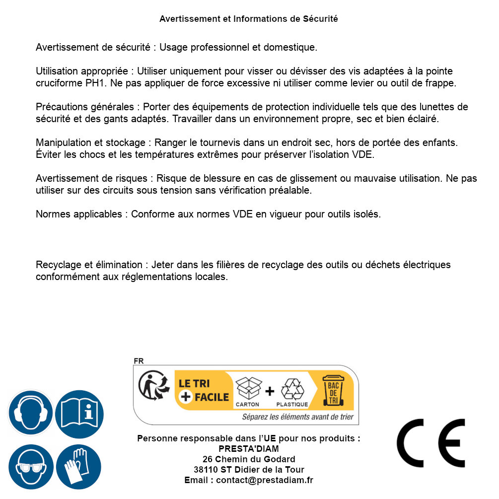 | AVERTISSEMENT et SECURITE | Identification de la personne responsable dans l’UE : Nom : PRESTA'DIAM. Adresse : 26 Chemin du Godard, 38110 ST Didier de la Tour (France). Email : contact@prestadiam.fr. |