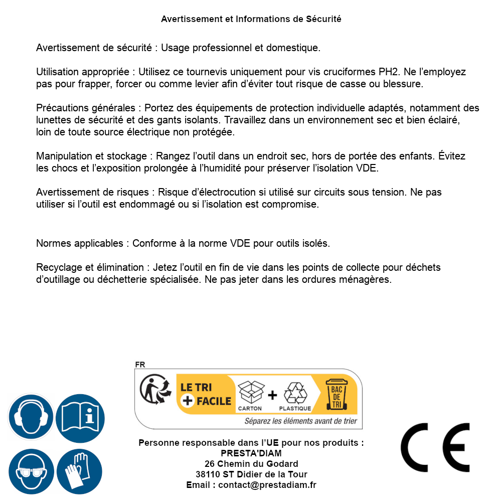 | AVERTISSEMENT et SECURITE | Identification de la personne responsable dans l’UE : Nom : PRESTA'DIAM. Adresse : 26 Chemin du Godard, 38110 ST Didier de la Tour (France). Email : contact@prestadiam.fr. |