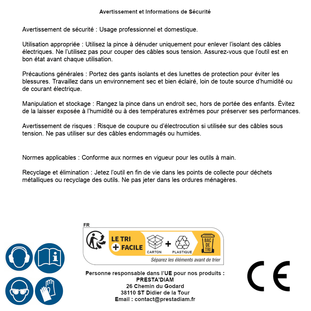 | AVERTISSEMENT et SECURITE | Identification de la personne responsable dans l’UE : Nom : PRESTA'DIAM. Adresse : 26 Chemin du Godard, 38110 ST Didier de la Tour (France). Email : contact@prestadiam.fr. |