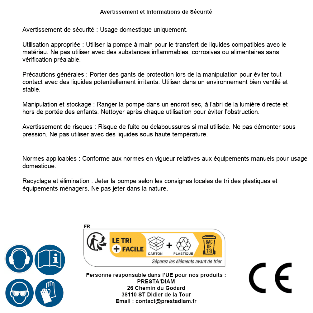 | AVERTISSEMENT et SECURITE | Identification de la personne responsable dans l’UE : Nom : PRESTA'DIAM. Adresse : 26 Chemin du Godard, 38110 ST Didier de la Tour (France). Email : contact@prestadiam.fr. |