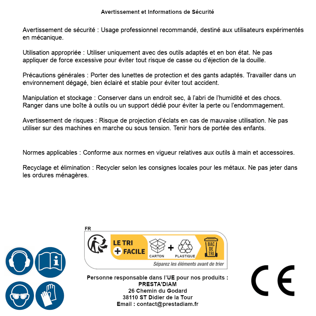 | AVERTISSEMENT et SECURITE | Identification de la personne responsable dans l’UE : Nom : PRESTA'DIAM. Adresse : 26 Chemin du Godard, 38110 ST Didier de la Tour (France). Email : contact@prestadiam.fr. |
