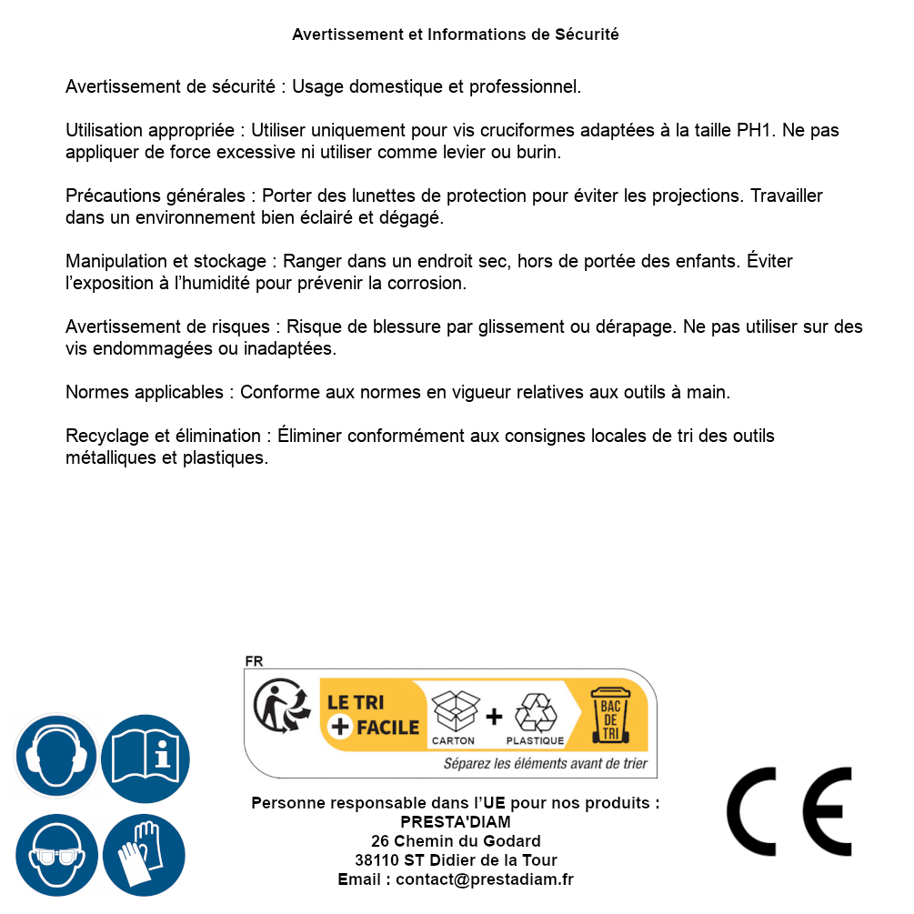| AVERTISSEMENT et SECURITE | Identification de la personne responsable dans l’UE : Nom : PRESTA'DIAM. Adresse : 26 Chemin du Godard, 38110 ST Didier de la Tour (France). Email : contact@prestadiam.fr. |
