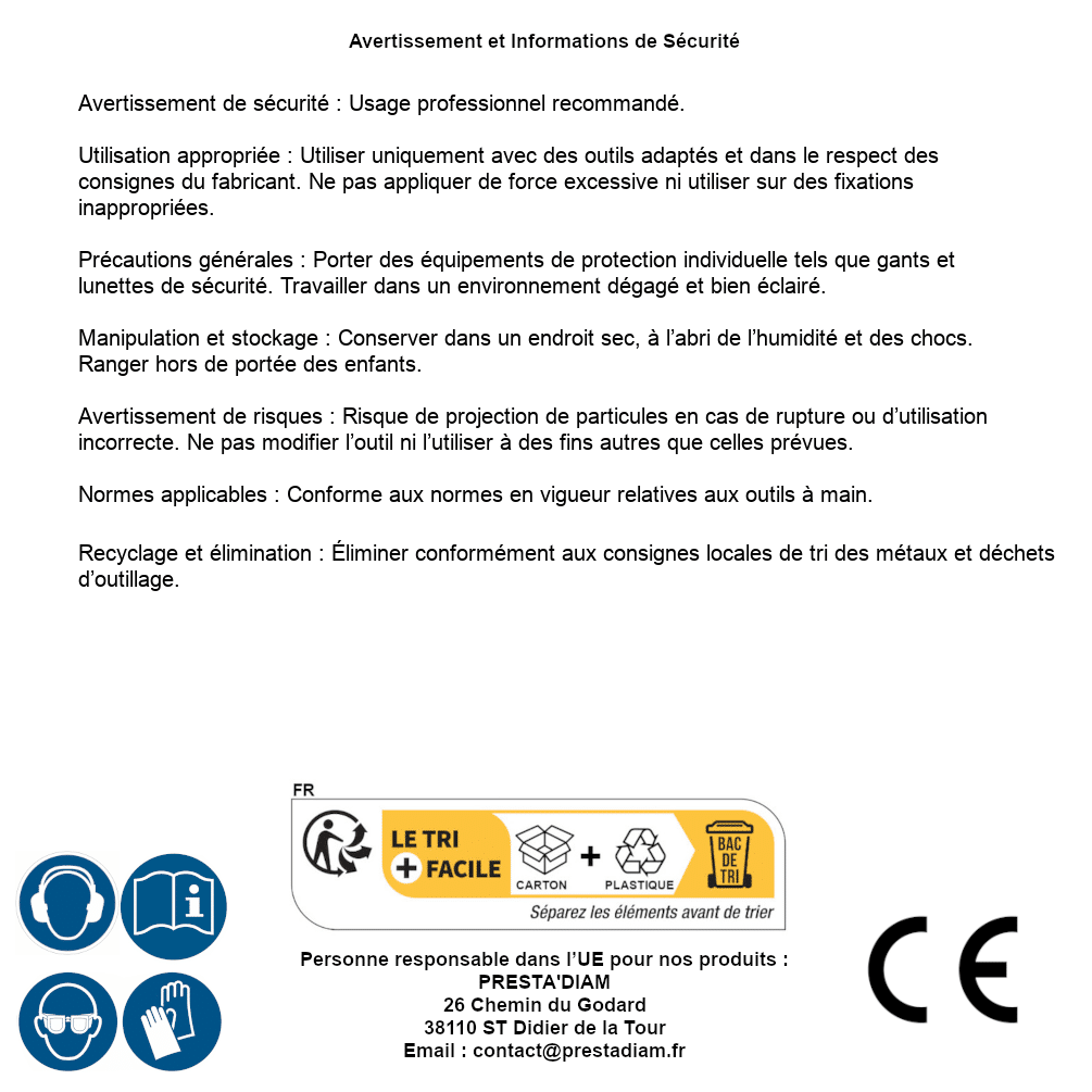 | AVERTISSEMENT et SECURITE | Identification de la personne responsable dans l’UE : Nom : PRESTA'DIAM. Adresse : 26 Chemin du Godard, 38110 ST Didier de la Tour (France). Email : contact@prestadiam.fr. |