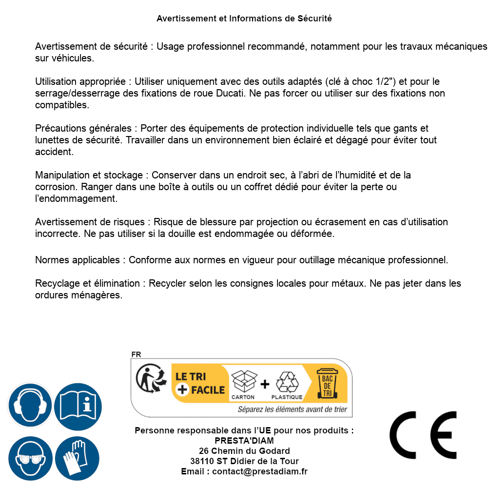 | AVERTISSEMENT et SECURITE | Identification de la personne responsable dans l’UE : Nom : PRESTA'DIAM. Adresse : 26 Chemin du Godard, 38110 ST Didier de la Tour (France). Email : contact@prestadiam.fr. |