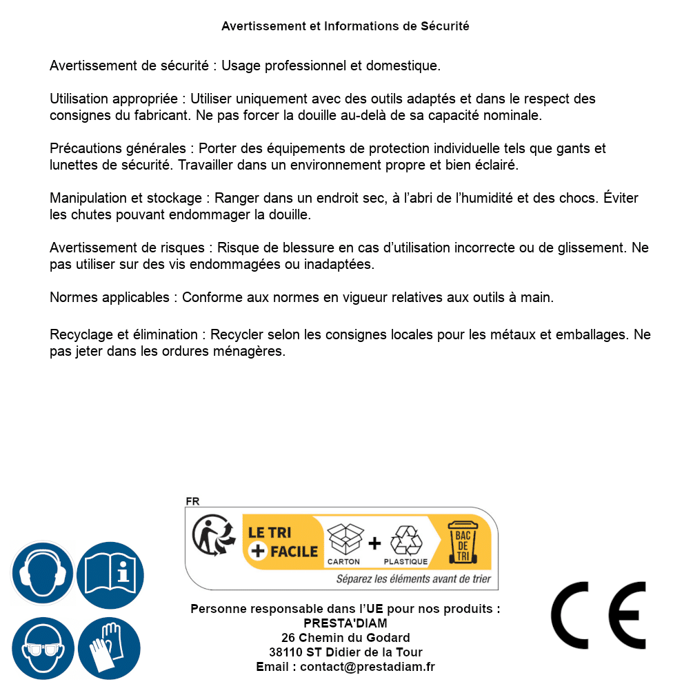 | AVERTISSEMENT et SECURITE | Identification de la personne responsable dans l’UE : Nom : PRESTA'DIAM. Adresse : 26 Chemin du Godard, 38110 ST Didier de la Tour (France). Email : contact@prestadiam.fr. |