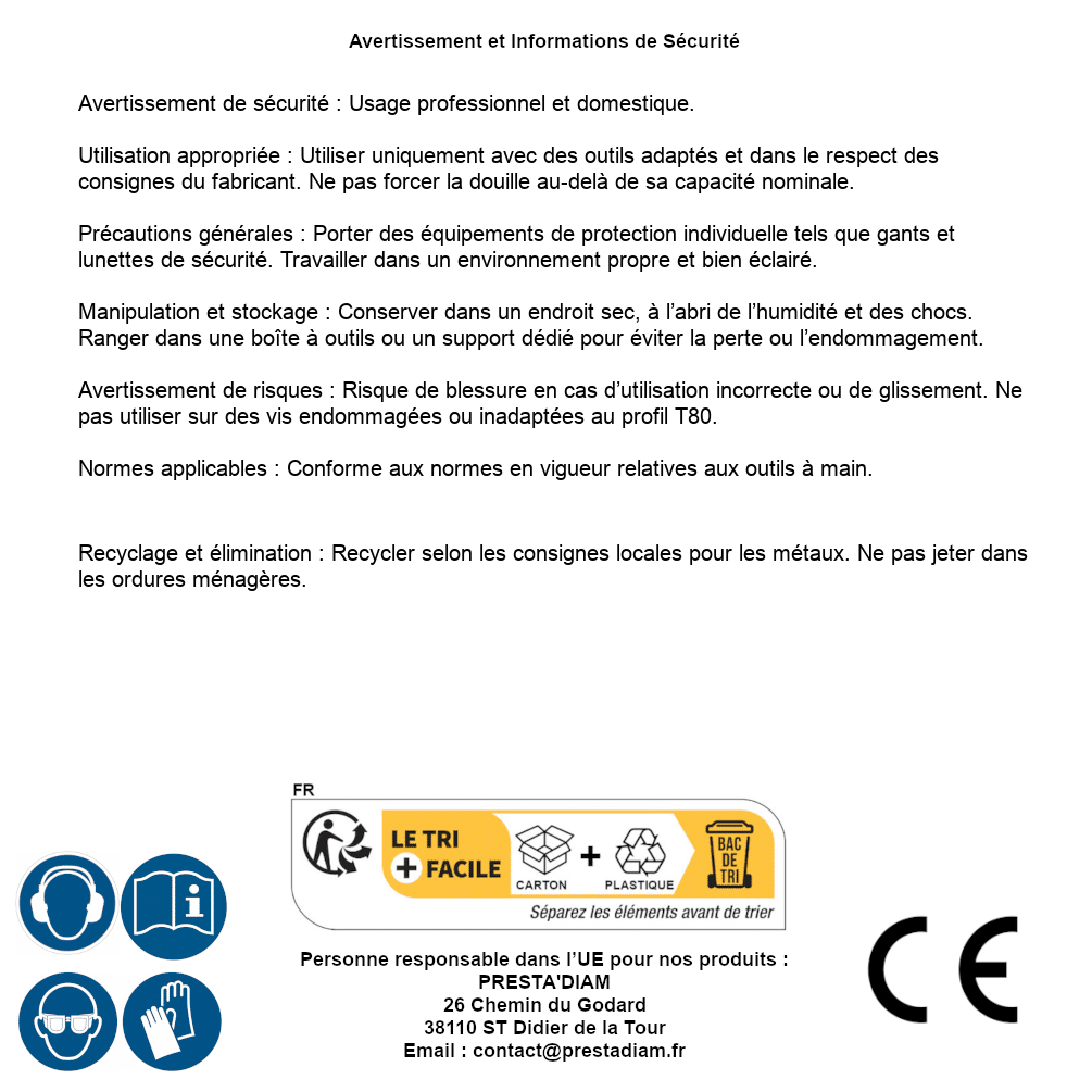 | AVERTISSEMENT et SECURITE | Identification de la personne responsable dans l’UE : Nom : PRESTA'DIAM. Adresse : 26 Chemin du Godard, 38110 ST Didier de la Tour (France). Email : contact@prestadiam.fr. |