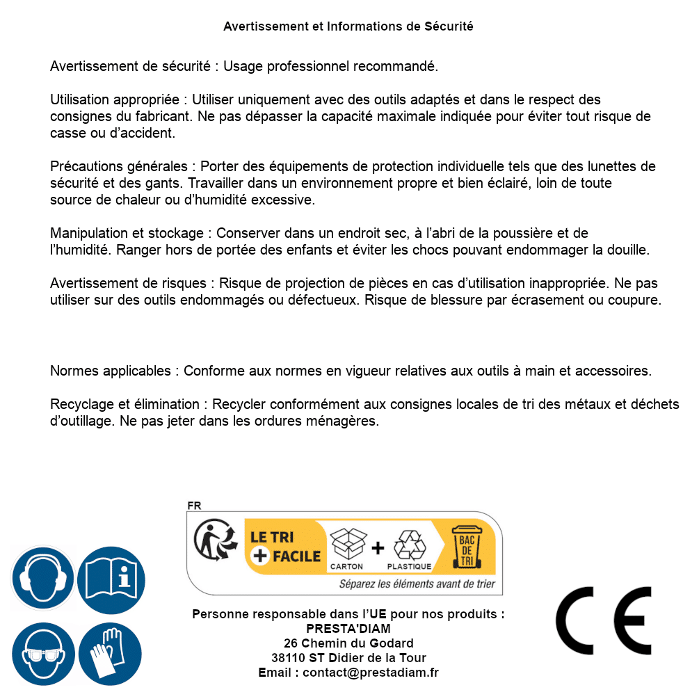 | AVERTISSEMENT et SECURITE | Identification de la personne responsable dans l’UE : Nom : PRESTA'DIAM. Adresse : 26 Chemin du Godard, 38110 ST Didier de la Tour (France). Email : contact@prestadiam.fr. |