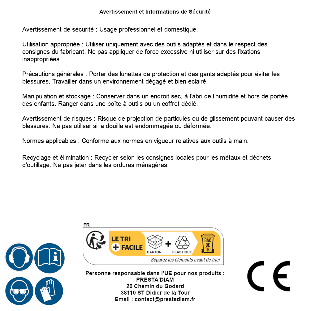 | AVERTISSEMENT et SECURITE | Identification de la personne responsable dans l’UE : Nom : PRESTA'DIAM. Adresse : 26 Chemin du Godard, 38110 ST Didier de la Tour (France). Email : contact@prestadiam.fr. |