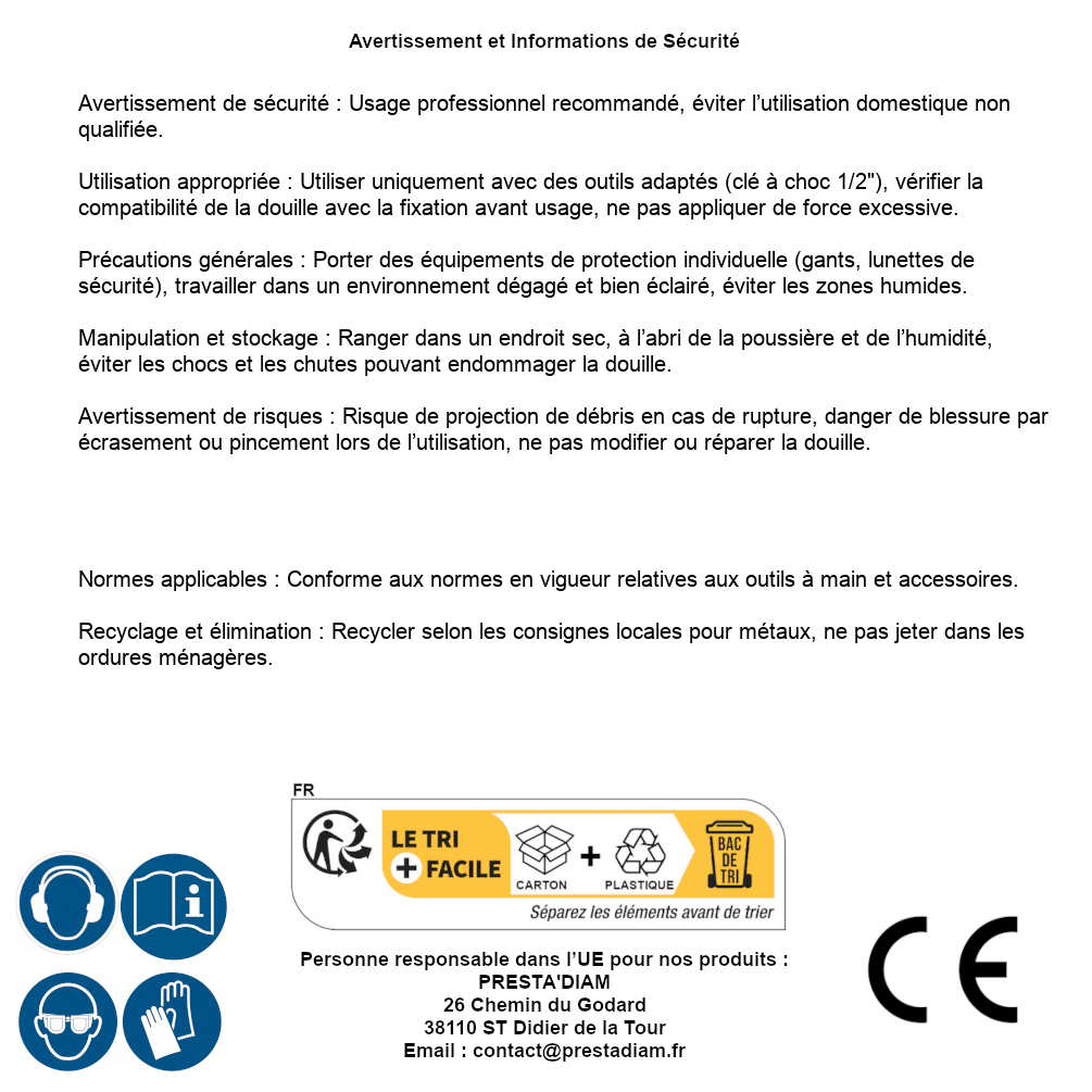 | AVERTISSEMENT et SECURITE | Identification de la personne responsable dans l’UE : Nom : PRESTA'DIAM. Adresse : 26 Chemin du Godard, 38110 ST Didier de la Tour (France). Email : contact@prestadiam.fr. |