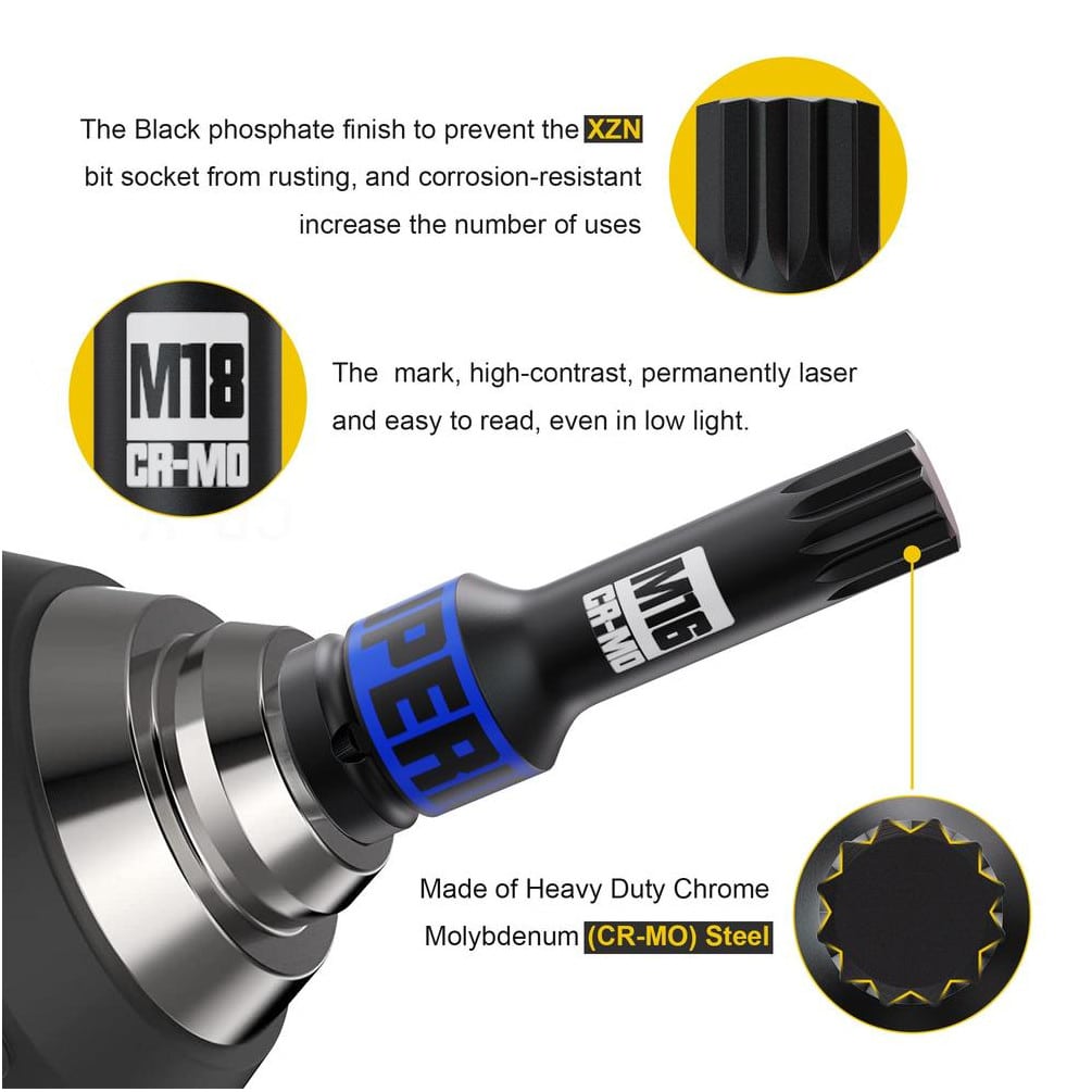 Utilisez cette douille avec un outil à choc 1/2" pour visser ou dévisser des fixations à tête XZN M5. Assurez-vous que la douille est bien engagée sur l'embout pour éviter tout glissement. Convient parfaitement aux travaux de mécanique automobile, industrielle et de maintenance générale.
