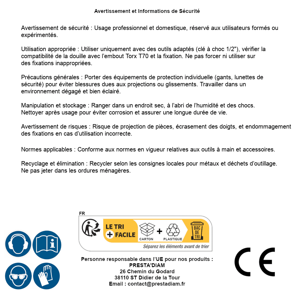 | AVERTISSEMENT et SECURITE | Identification de la personne responsable dans l’UE : Nom : PRESTA'DIAM. Adresse : 26 Chemin du Godard, 38110 ST Didier de la Tour (France). Email : contact@prestadiam.fr. |