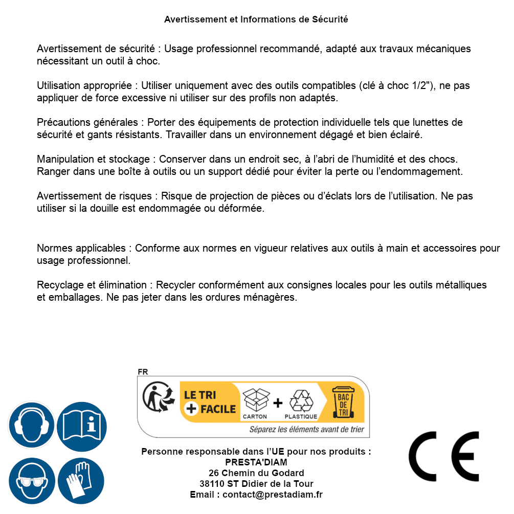 | AVERTISSEMENT et SECURITE | Identification de la personne responsable dans l’UE : Nom : PRESTA'DIAM. Adresse : 26 Chemin du Godard, 38110 ST Didier de la Tour (France). Email : contact@prestadiam.fr. |