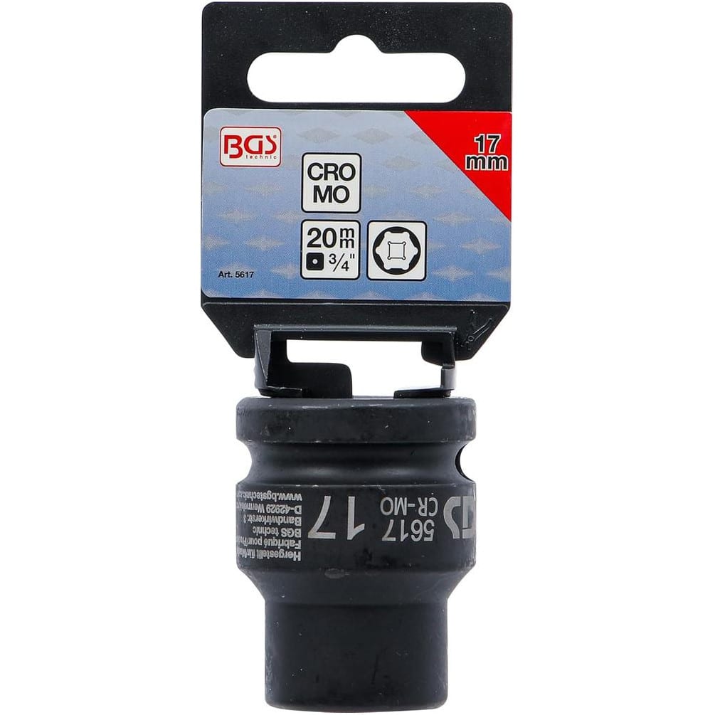 La Douille à Choc Six Pans 20 mm (3/4") - 17 mm de la marque BGS est un outil robuste conçu pour les travaux de mécanique et d'entretien nécessitant une haute résistance et une précision optimale. Fabriquée en acier de qualité, cette douille est idéale pour les écrous et boulons à six pans, offrant une prise ferme et une durabilité accrue.Caractéristiques principales