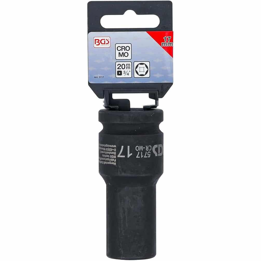 La Douille à Choc Six Pans Longue 20 mm (3/4") - 17 mm de la marque BGS est un outil robuste et précis conçu pour les travaux de mécanique et d'entretien nécessitant une forte puissance de serrage ou desserrage. Sa conception longue permet d'atteindre des écrous ou boulons situés dans des endroits difficiles d'accès, tout en assurant une excellente prise grâce à sa forme six pans.Caractéristiques principales