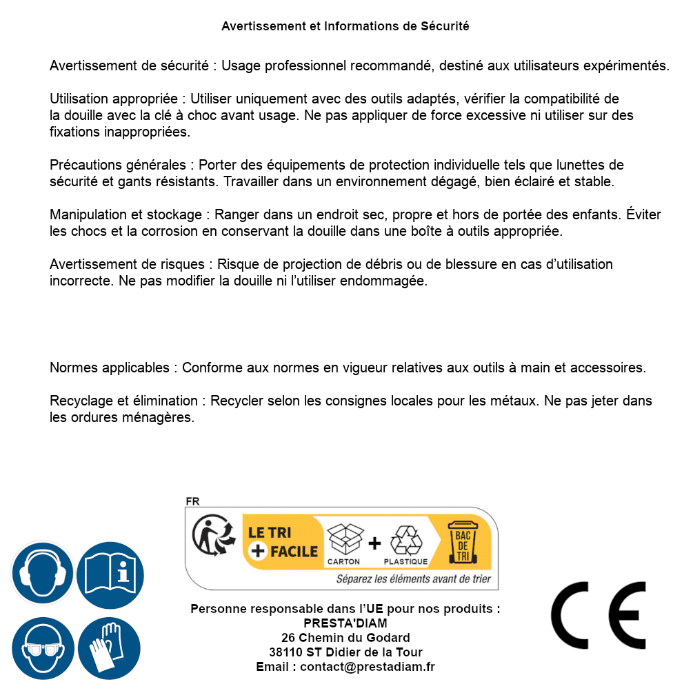 | AVERTISSEMENT et SECURITE | Identification de la personne responsable dans l’UE : Nom : PRESTA'DIAM. Adresse : 26 Chemin du Godard, 38110 ST Didier de la Tour (France). Email : contact@prestadiam.fr. |