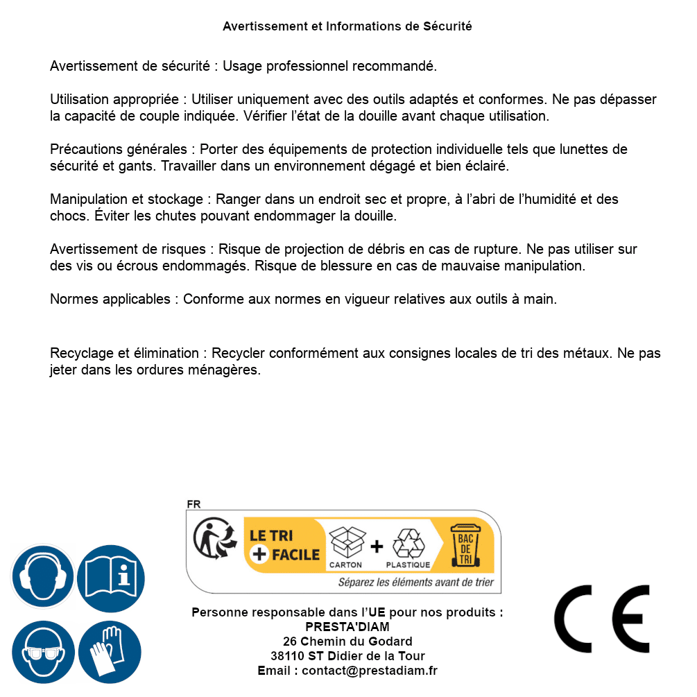 | AVERTISSEMENT et SECURITE | Identification de la personne responsable dans l’UE : Nom : PRESTA'DIAM. Adresse : 26 Chemin du Godard, 38110 ST Didier de la Tour (France). Email : contact@prestadiam.fr. |
