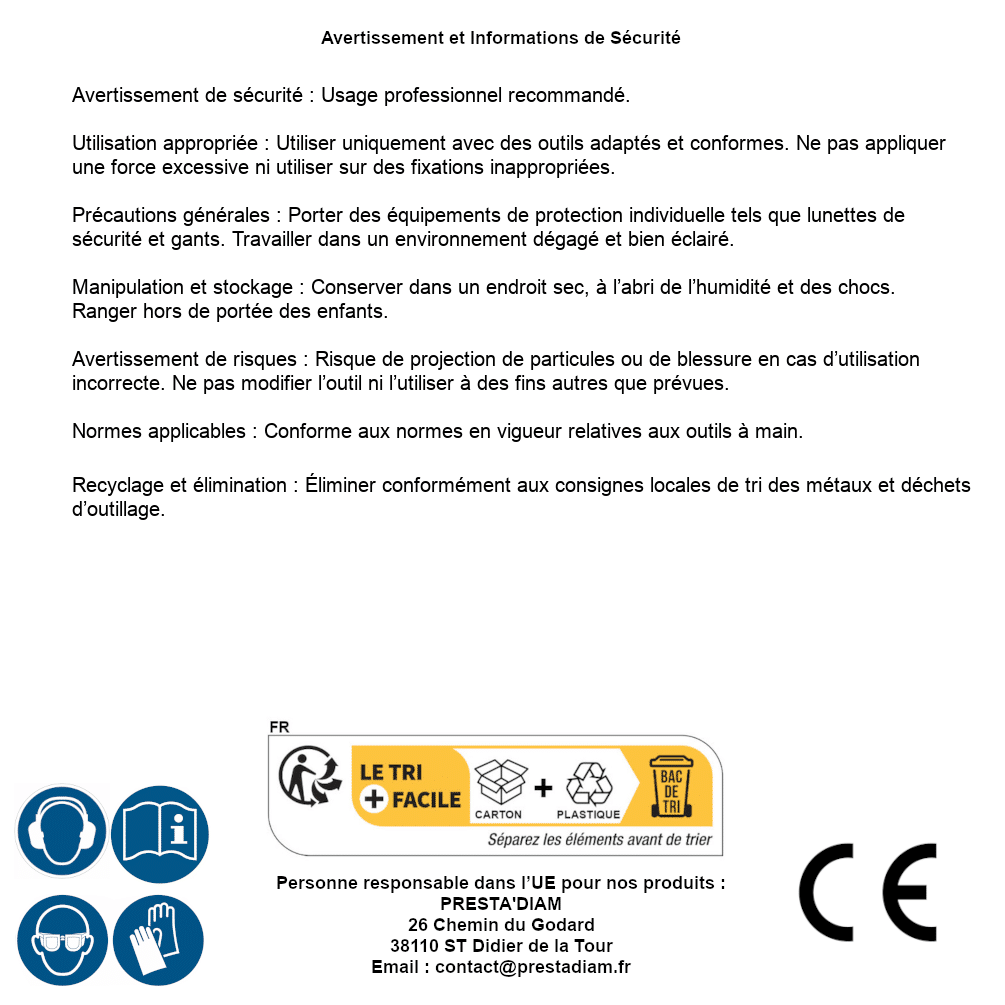 | AVERTISSEMENT et SECURITE | Identification de la personne responsable dans l’UE : Nom : PRESTA'DIAM. Adresse : 26 Chemin du Godard, 38110 ST Didier de la Tour (France). Email : contact@prestadiam.fr. |