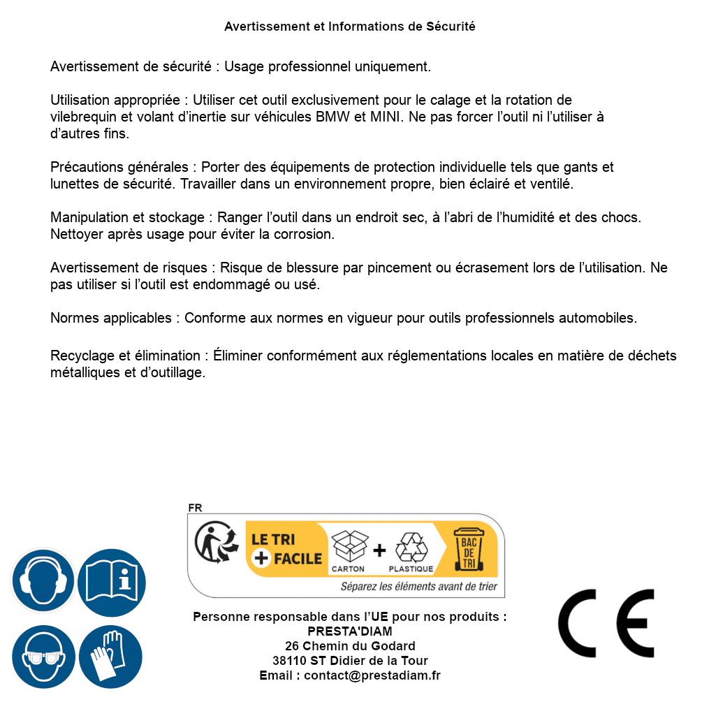 | AVERTISSEMENT et SECURITE | Identification de la personne responsable dans l’UE : Nom : PRESTA'DIAM. Adresse : 26 Chemin du Godard, 38110 ST Didier de la Tour (France). Email : contact@prestadiam.fr. |