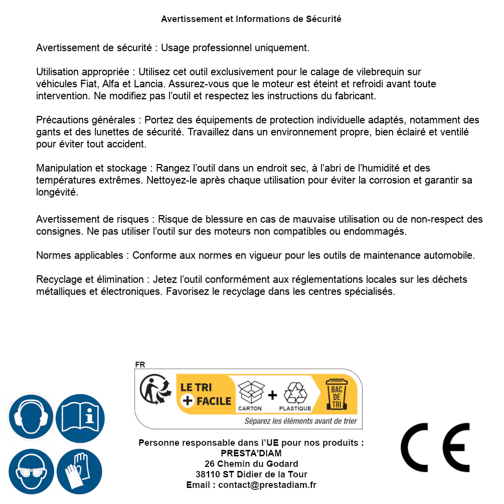 | AVERTISSEMENT et SECURITE | Identification de la personne responsable dans l’UE : Nom : PRESTA'DIAM. Adresse : 26 Chemin du Godard, 38110 ST Didier de la Tour (France). Email : contact@prestadiam.fr. |